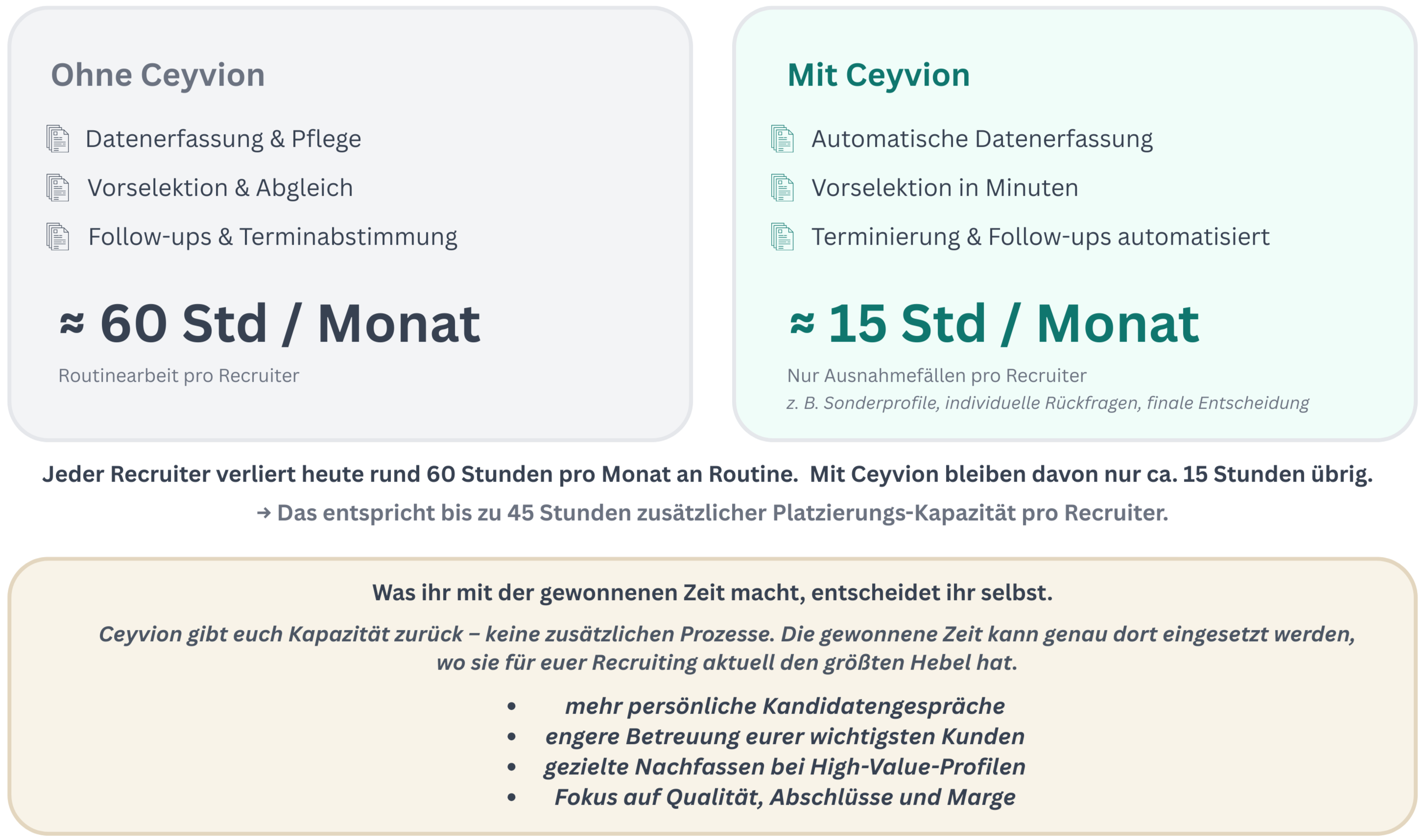 Ceyvion automatisiert Erstkontakt, Vorselektion und Terminierung - damit eure Recruiter mehr Zeit für Placements und Umsatz haben.