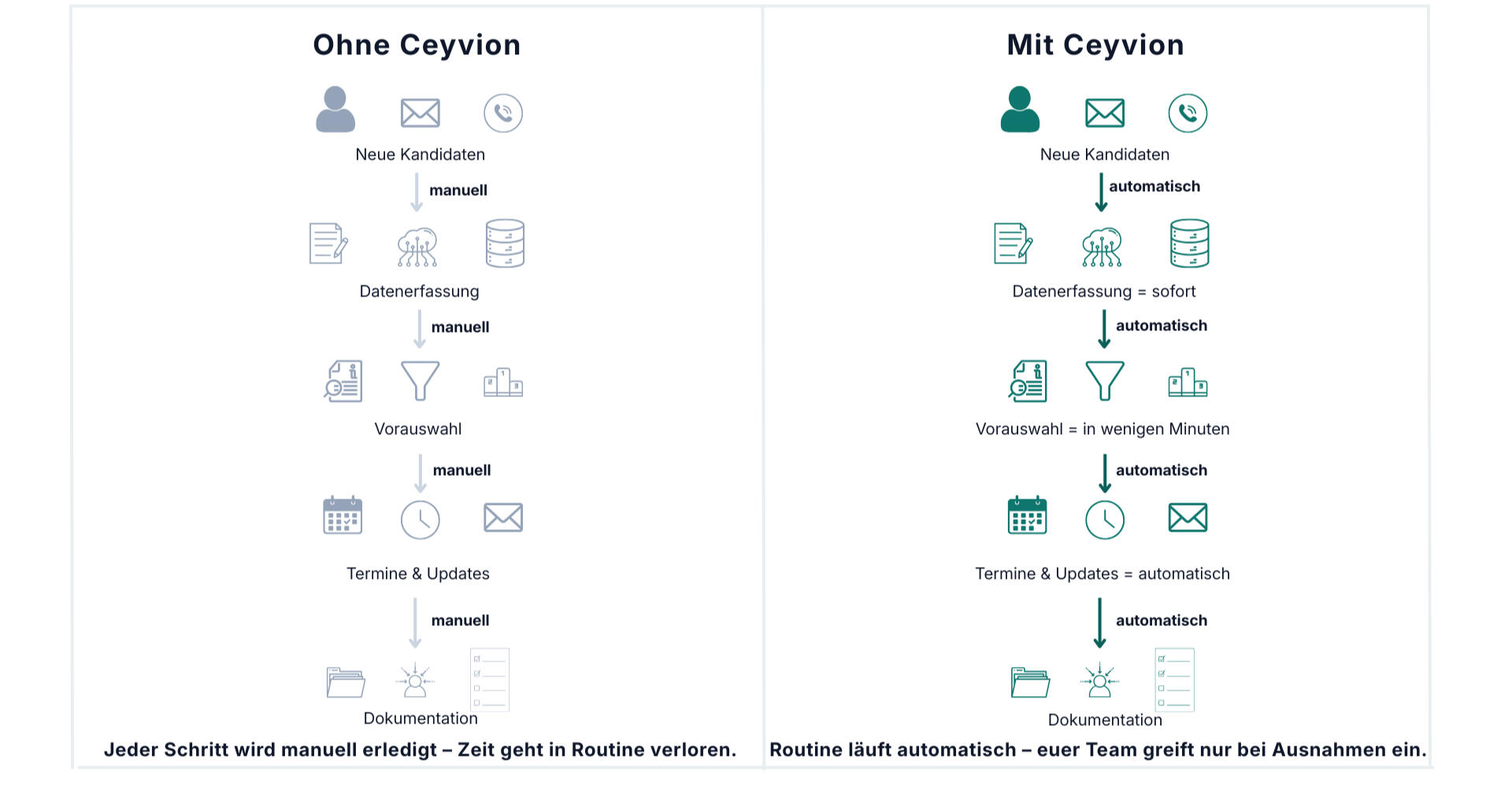 Ohne Ceyvion erledigt ihr jeden Schritt manuell – von der Datenerfassung bis zur Dokumentation.Mit Ceyvion laufen diese Schritte automatisch.