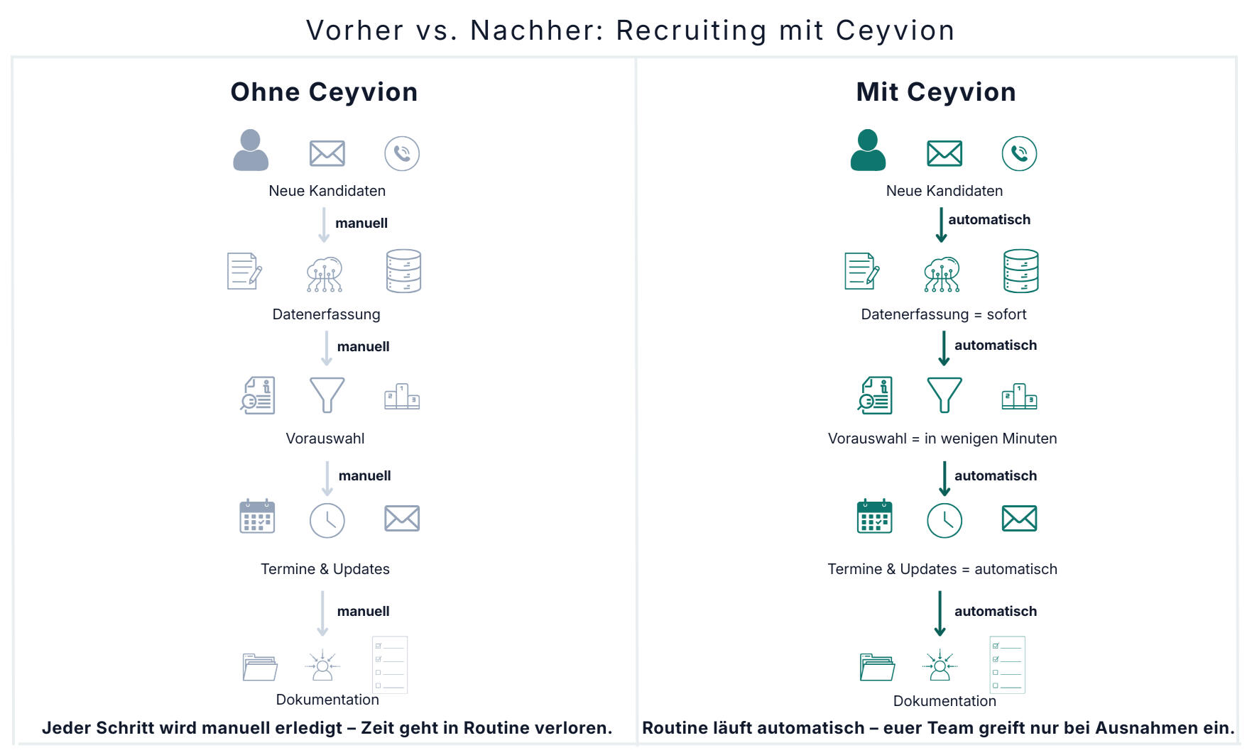 Automatisierte Recruiting-Abläufe für Agenturen.Ceyvion übernimmt wiederkehrende Aufgaben im Recruiting – vom Erstkontakt bis zur Einstellung.So gewinnt euer Team Zeit für das, was Umsatz bringt: die richtigen Kandidaten zu platzieren.