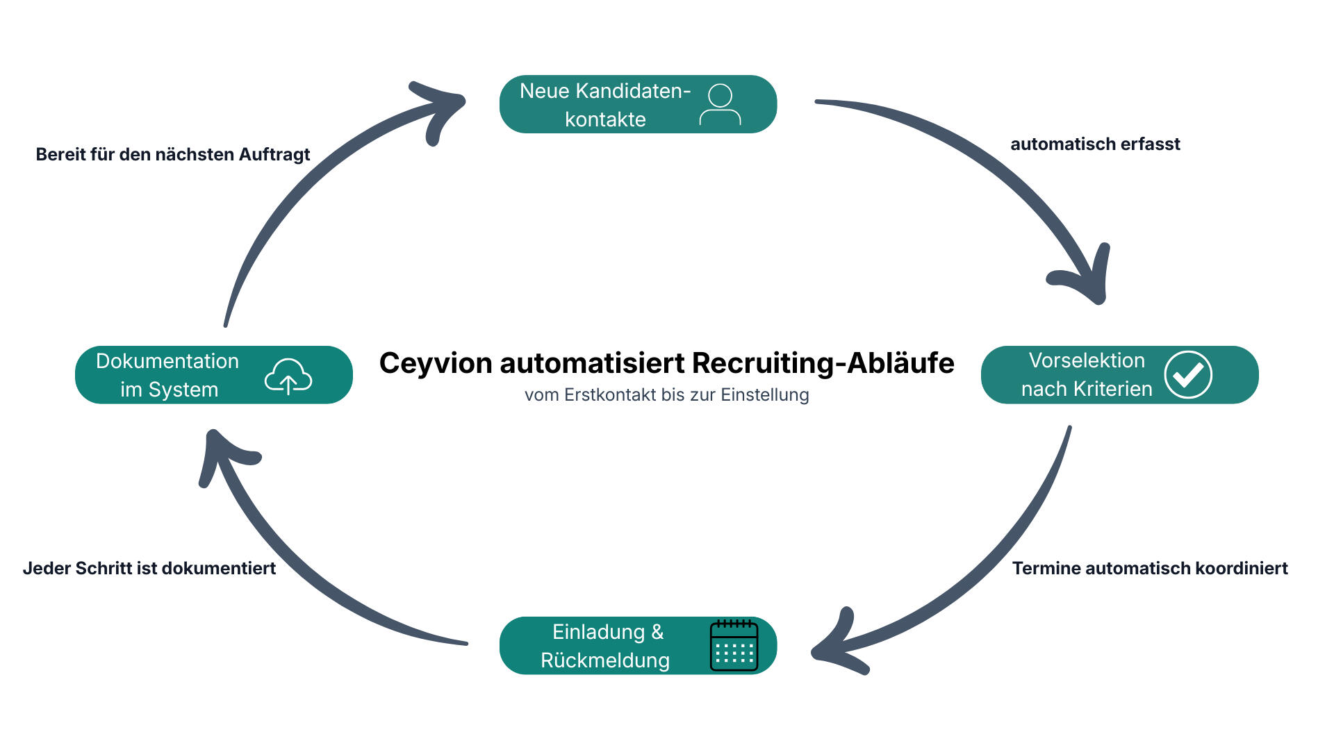 Ceyvion automatisiert Erstkontakt, Vorselektion und Terminierung - damit eure Recruiter mehr Zeit für Placements und Umsatz haben.